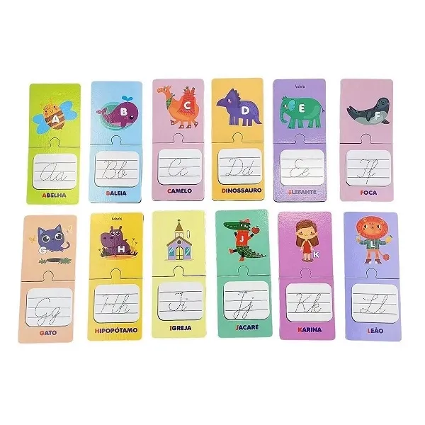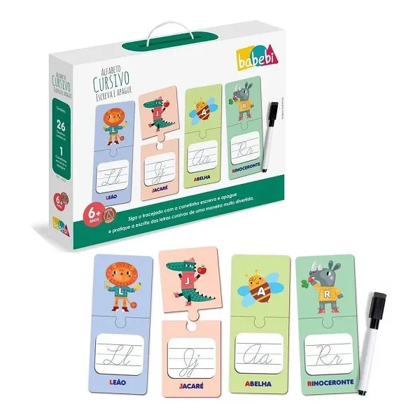 Este é um Brinquedo Educativo que tem como objetivo ensinar as crianças a escrever em letra cursiva de forma lúdica e interativa. O jogo é composto por 26 fichas ilustradas com letras cursivas, que podem ser escritas e apagadas quantas vezes a criança quiser.