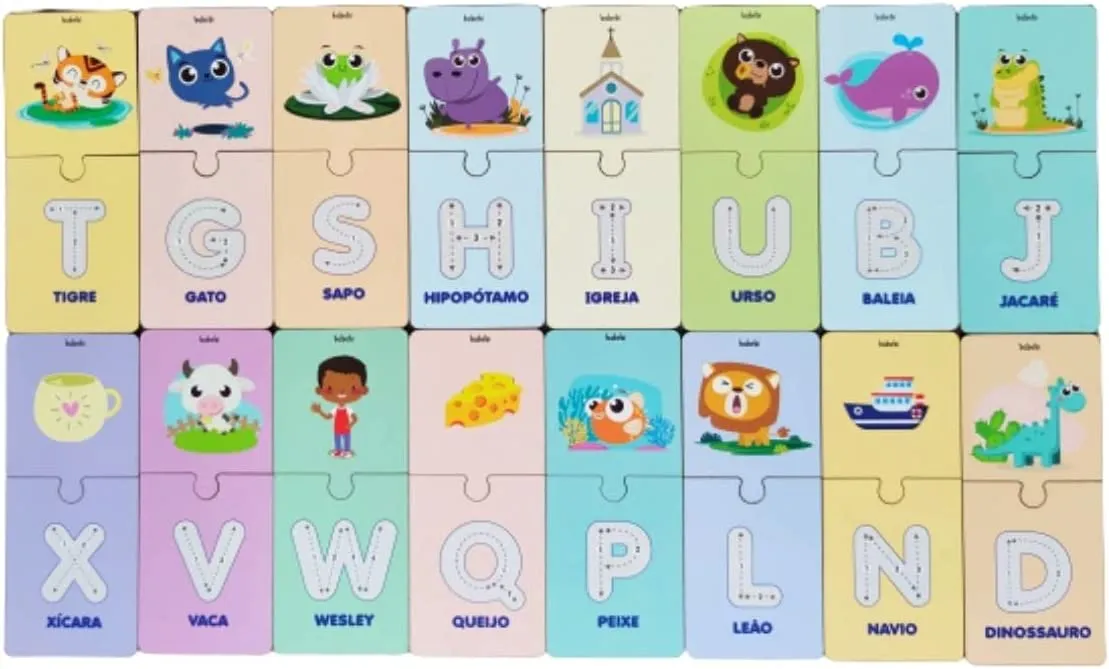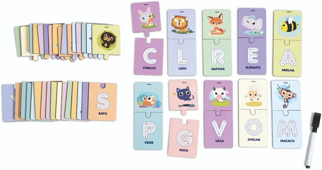 São 26 peças de um quebra-cabeça com o alfabeto e ilustrações medindo 13 x 5cm, além de 1 canetinha escreva e apague. Junte as figuras às suas letras iniciais e siga o tracejado com a canetinha escreva e apague. Assim a criança poderá treinar a escrita de uma forma divertida e interessante.