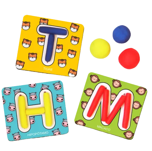 A união perfeita para os pequenos artistas: massinha de modelar + letrinhas do alfabeto! São 26 placas grandes de madeira com o tracejado das letras para a criança moldar cada uma delas. Além disso, em cada placa tem-se figuras que são relacionadas com a letra correspondente (T de tigre tem vários tigrinhos). Uma ótima opção para fortalecimento dos dedinhos e desenvolvimento da coordenação motora fina, além do aprendizado das letras do alfabeto.