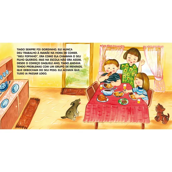 Tiago era gordinho. Apenas por causa disso começou a ser perseguido por um grupo de meninos. No início, eles só zombavam do seu peso, mas depois passaram a bater nele. Tiago foi muito corajoso e, depois de se defender em uma briga, viu que já era hora de contar tudo em casa. Os pais ajudaram a resolver a situação, falando com a direção da escola.