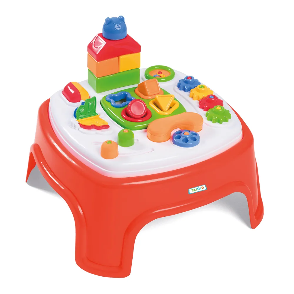Mesinha didática com diversas formas para empilhar, blocos coloridos de encaixe, engrenagens, esfera giratória, e peças que deslizam, divertem e estimulam a coordenação dos pequeninos.