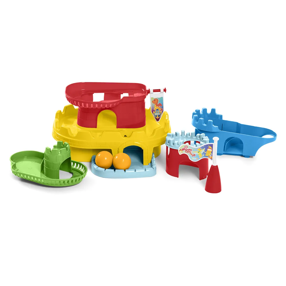 Tem formato de castelo e ainda é um super tobogã. São quatro andares para as bolinhas deslizarem. E vem com bandeiras para identificar o reino que é inteiramente desmontável! São 8 peças empilháveis para desmontar, montar e formar o castelo.