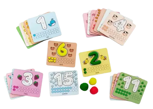 Aprender os números e suas quantidades ficou muito mais divertido com esse conjunto de plaquinhas ilustradas e massinhas coloridas para modelar / +3 Anos