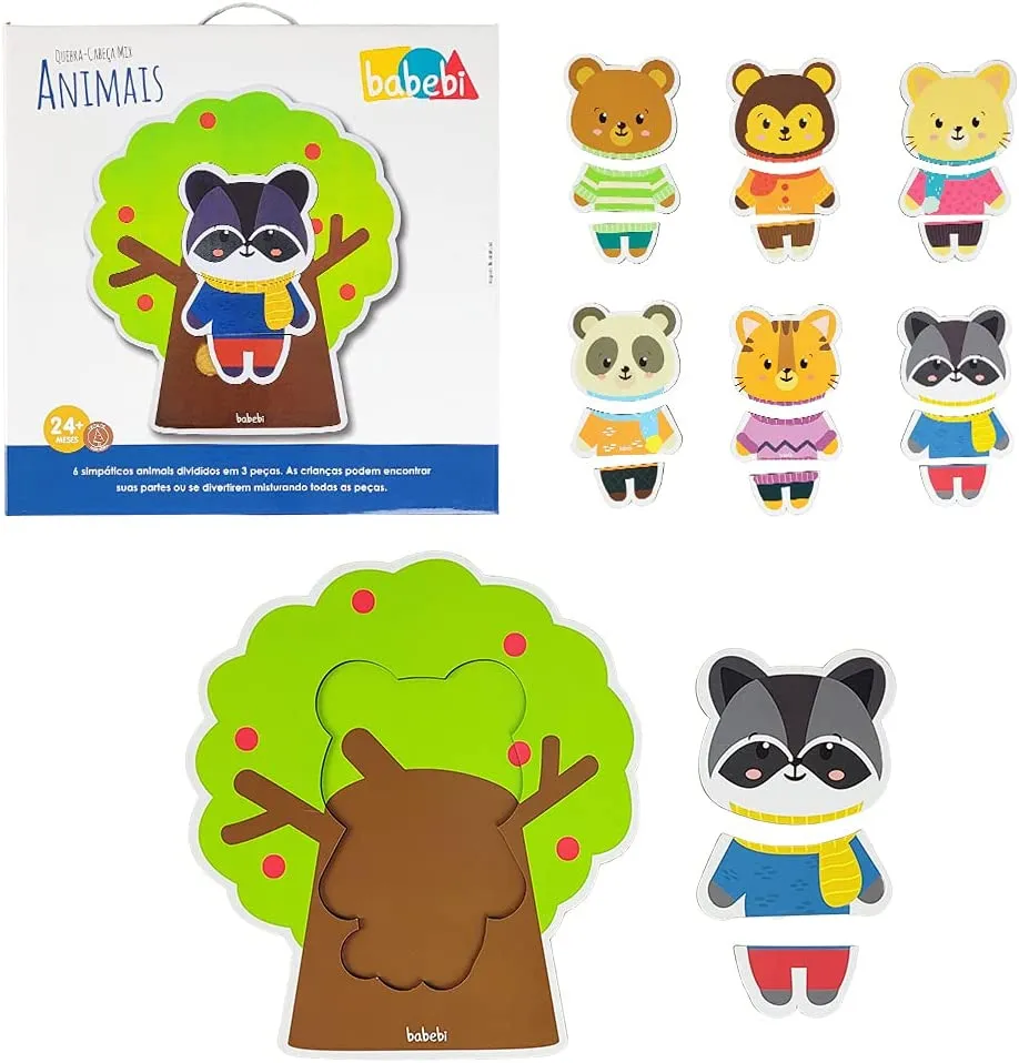Quebra Cabeça Mix - Animais 6 animais simpáticos divididos em 3 peças. As crianças podem encantar suas partes ou se divertirem misturando todas as peças. Feito de madeira reflorestada. Utilizamos materiais seguros, duráveis e ecológicos. Dimensões aproximadas do produto (cm) – (C x A x L) 28 x 28 x 4,5 cm.  Observe atentamente a idade recomendada para o brinquedo. Pode conter partes pequenas que podem ser engolidas e perigosas.
